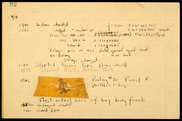 އެދުވަހު މާކް II މަރާމާތު ކުރުމަށް އެ ސޫފި ނަގާ، ސައިންވެރިންގެ ލޮގް ފޮތެއްގައި އެމީހުން އޭތި ޓޭޕްއަޅާ ތަތް ކުރިއެވެ. އަދި އެދުވަހުގެ 15:45 ގައި ހިނގި ކަމެއްގެ ގޮތުގައި އެއާއެކު "First actual case of bug being found (ހަގީގީ ބަގެއް ފެނުނު ފުރަތަމަ ކޭސް)" މިގޮތަށް ނޯޓު ކޮށްފައިވެއެވެ.