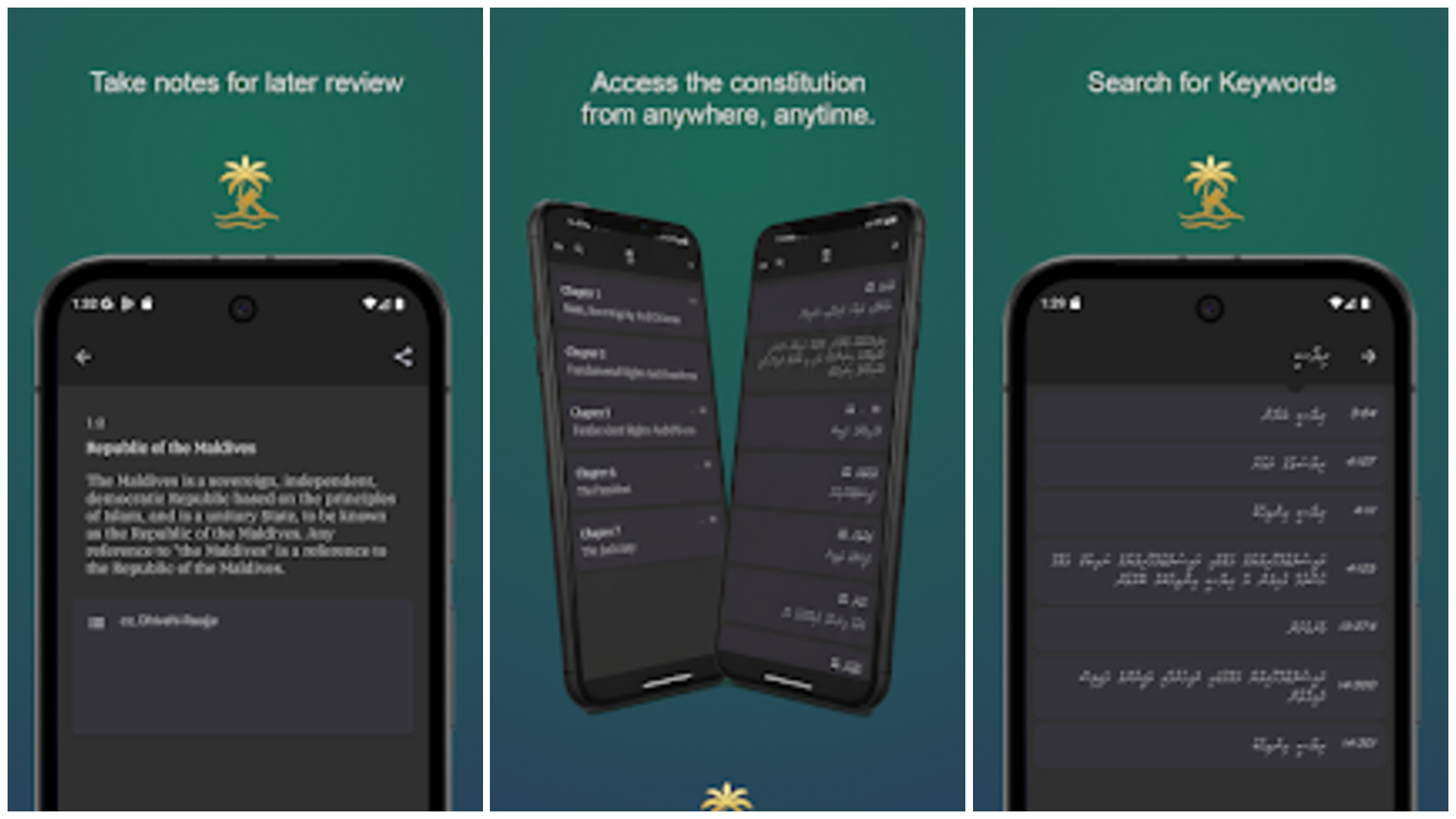 ދިވެހިރާއްޖޭގެ ޤާނޫނު އަސާސީގެ އެޕްލިކޭޝަން "MV Constitution" ގެ ނަމުގައި ދިވެހި އަދި އިނގިރޭސި ބަހުން ވެސް ކިޔޭގޮތަށް ތައާރަފްކޮށްފައިވާއިރު، މި އެޕްލިކޭޝަންއަކީ ދިވެހި ޤާނޫނު އަސާސީ ފަސޭހައިން ޑިޖިޓަލްކޮށް ފޯނުން ބަލާލުމަށް މަގުފަހިކޮށްދޭނެ އެޕްލިކޭޝަނެކެވެ.