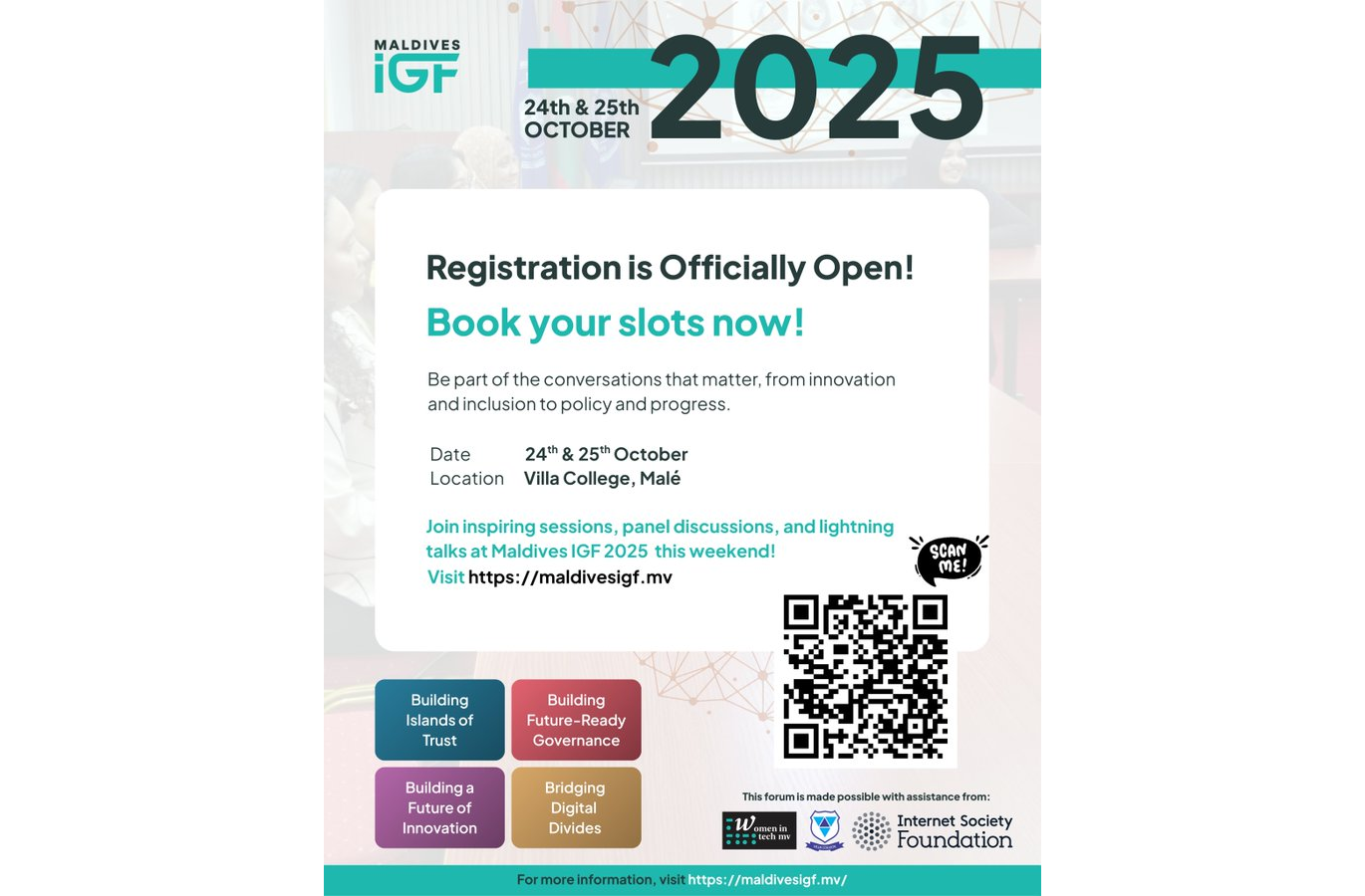 މިއަހަރުގެ ފޯރަމް އިންތިޒާމްކުރަނީ ވިމެން އިން ޓެކް މޯލްޑިވްސް އާއި ވިލާ ކޮލެޖް ގުޅިގެން، އިންޓަނެޓް ސޮސައިޓީ ފައުންޑޭޝަންގެ އިންޓަނެޓް ގަވަރނަންސް ފޯރަމް އިވެންޓްސް ގްރާންޓް ޕްރޮގްރާމްގެ އެހީތެރިކަމާއެކުގައެވެ.