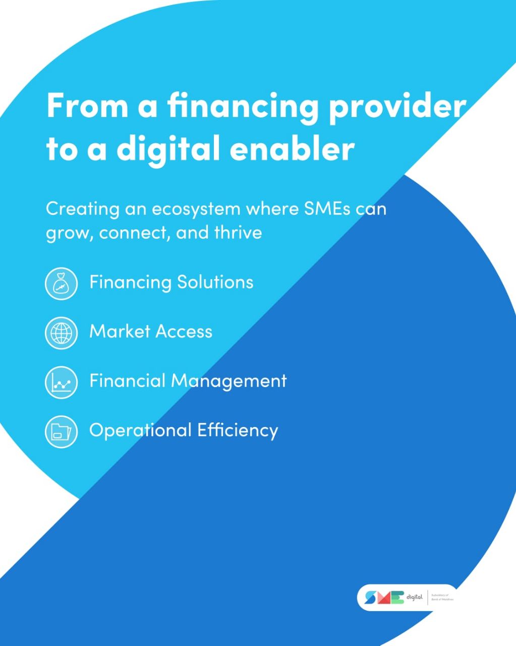 މި ބަދަލާއެކު، އެސްއެމްއީ ޑިޖިޓަލް ވެގެންދާނީ ހަމައެކަނި ލޯނު ދޫކުރާ ތަނަކަށްވުރެ، ވިޔަފާރިތަކުގެ ދުވަހީ ހިންގުންތައް ޑިޖިޓަލައިޒްކޮށް، މާލީ މުއާމަލާތްތައް ފަސޭހަކަމާއެކު ބެލެހެއްޓޭނެ ޓޫލްތައް ފޯރުކޮށްދޭ، އަދި އޮންލައިންކޮށް މާކެޓަށް ނުކުތުމަށް އެހީތެރިވެދޭ ޓެކްނޮލޮޖީ ޕާޓްނަރަކަށެވެ. ކުންފުނީގެ އަމާޒަކީ ވިޔަފާރިއެއް ފެށުމުގެ ފިކުރުން ފެށިގެން، އެ ވިޔަފާރިއެއް ހިންގައި ތަރައްގީކުރުމުގެ ކޮންމެ މަރުހަލާއަކަށް ބޭނުންވާ ޑިޖިޓަލް ވަސީލަތްތައް އެއް ޕްލެޓްފޯމަކުން ފޯރުކޮށްދިނުމެވެ.