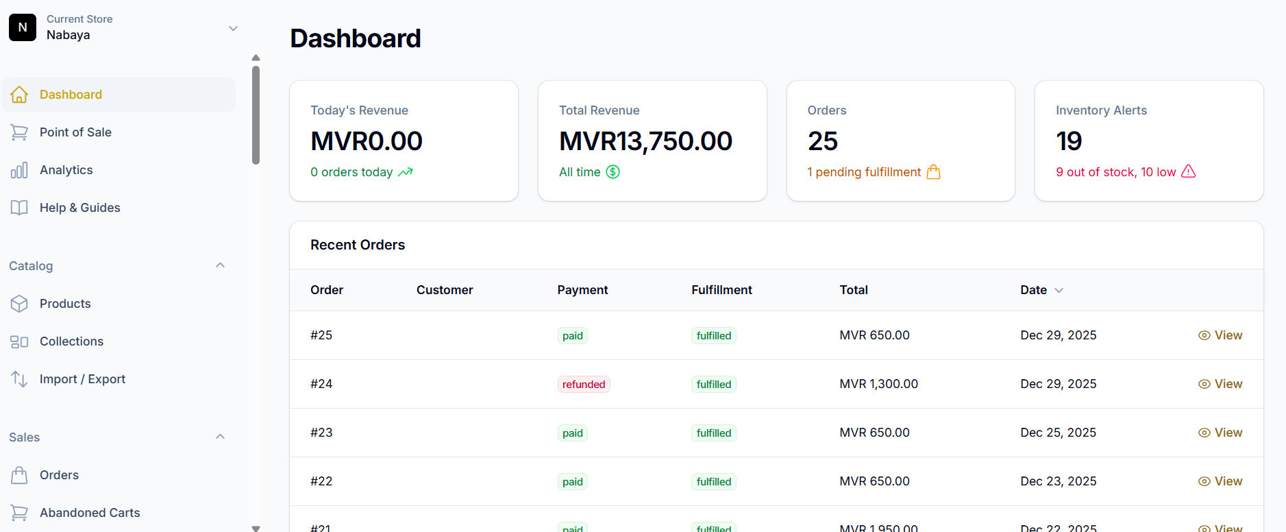 - މި ޕްލެޓްފޯމްގައި އިންވެންޓްރީ ރިޕޯޓުތައް ބަލައި ކަސްޓަމަރުން މުދާ ގަންނަ ގޮތްތައް ބަލާލައި އޭގެ ޕާފޮމެންސް ޓްރެކްކޮށްލެވެއެވެ.