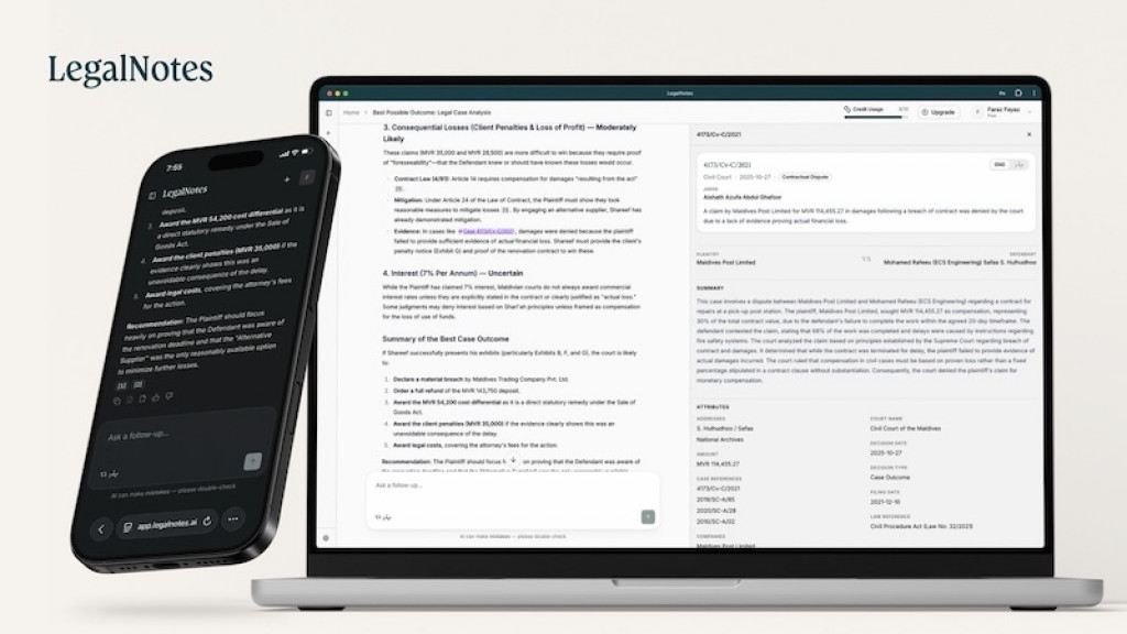 ދިވެހިރާއްޖޭގެ ޤާނޫނުތަކާއި ގަވާއިދުތައް ހޯދައި ދެނެގަތުން ފަސޭހަކޮށްދިނުމަށްޓަކައި، އާޓިފިޝަލް އިންޓެލިޖެންސް (AI) ބޭނުންކޮށްގެން ފަރުމާކޮށްފައިވާ އައު ޕްލެޓްފޯމެއް ކަމަށްވާ "LegalNotes" އިފްތިތާޙުކޮށްފިއެވެ. މި ޕްލެޓްފޯމަކީ އޭއައިގެ އެހީތެރިކަމާއެކު ޤާނޫނީ ދިރާސާތައް ކުރެވޭނެ މާޙައުލެއް ފޯރުކޮށްދޭ ތަނެކެވެ. މީގެ ސަބަބުން، ބޭނުންކުރާ ފަރާތްތަކަށް އާދައިގެ ފަސޭހަ އިންޓަފޭސްއެއް މެދުވެރިކޮށް ކޯޓު މައްސަލަތަކާއި، ޤާނޫނުތަކާއި، އަދި ގަވާއިދުތަކާ ގުޅޭ މަޢުލޫމާތު ހޯދޭނެއެވެ.