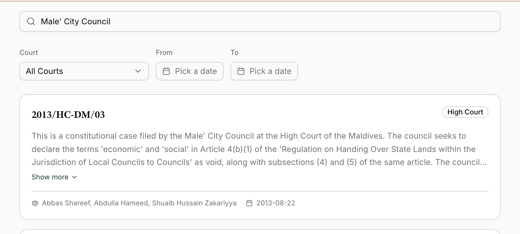 މިސާލަކަށް، މާލެ ސިޓީ ކައުންސިލާ ގުޅުންހުރި ކަންކަން ހޯދާއިރު، ހައިކޯޓުން ބަލާފައިވާ ދުސްތޫރީ މައްސަލަތަކާއި، އެ މައްސަލަތަކުގައި ހިމެނޭ ޤާނޫނީ ޚިލާފުތަކާއި، ގޮންޖަހާފައިވާ މާއްދާތަކުގެ ކުރު ތަފުސީލެއް ފެންނަން ހުންނާނެއެވެ. މީގެ އިތުރުން، އިތުރު ތަފުސީލުތަކާއި މައްސަލައިގެ ފުރިހަމަ ރެކޯޑު ބަލާލުމަށް ނަތީޖާތައް ފުޅާކޮށްލެވޭނެއެވެ.