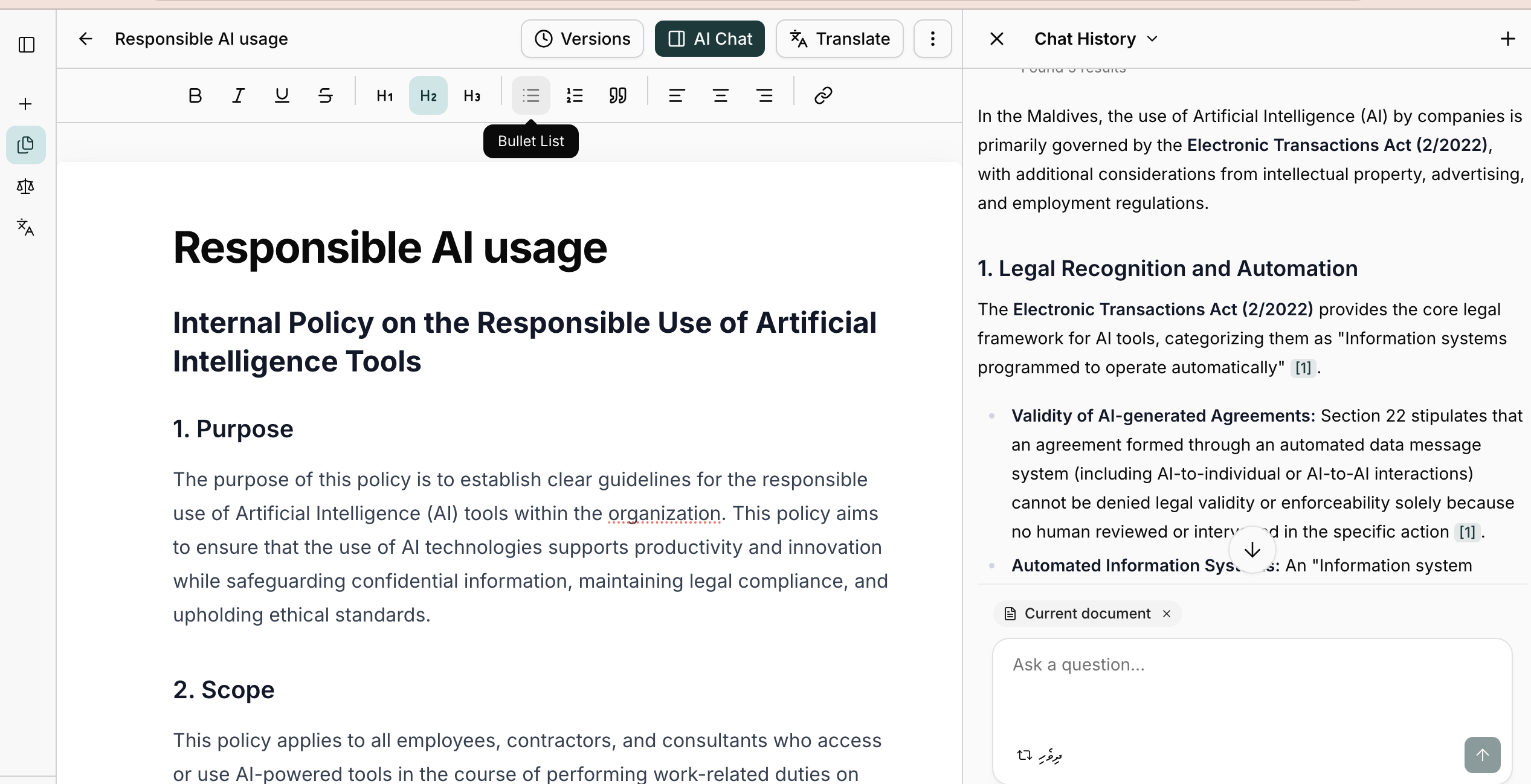 ލިޔެކިޔުންތައް ތައްޔާރުކުރާ މި މާހައުލުގައި އޭ.އައި (AI) ޗެޓް އެސިސްޓެންޓެއް ހިމެނެއެވެ. މީގެ ސަބަބުން، ލިޔުމެއްގެ މަސައްކަތް ކުރަމުންދާއިރު، އެޑިޓަރުގެ ތެރެއިން ސީދާ ގުޅުންހުރި ގާނޫނީ މައުލޫމާތުތައް—އެގޮތުން ކޯޓު ހުކުމްތަކާއި، ގާނޫނީ މާއްދާތަކާއި، ގަވާއިދުތައް—ހޯދުމުގެ މަގު ފަހިވެގެންދެއެވެ.