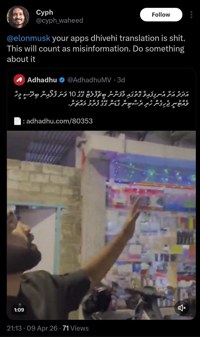 މިއަދުގެ ޑިޖިޓަލް ޒަމާނުގައި ދިވެހިންގެ މެދުގައި ޚަބަރާއި މައުލޫމާތު ފެތުރުމަށާއި، ސިޔާސީ އަދި އިޖުތިމާއީ ބަހުސްތައް ކުރުމަށް އެންމެ ފުޅާ ދާއިރާއެއްގައި ބޭނުންކުރާ އެއް މަންސައަކީ 'އެކްސް' (ކުރީގެ ޓްވިޓަރ) އެވެ. ދިވެހިރާއްޖޭގެ ރައްޔިތުންނާއި ސަރުކާރުގެ އިސްވެރިން ވެސް ރަސްމީ މުއާމަލާތްތަކަށް މި މަންސަ ބޭނުންކުރަމުން އަންނައިރު، އީލޮން މަސްކްގެ މި މަންސައިގައި ބޭނުންކުރާ އޭއައި އެސިސްޓަންޓް "ގްރޮކް" (Grok) މެދުވެރިކޮށް ދިވެހި ބަސް ތަރުޖަމާ ކުރުމުގައި ހަދަމުންދާ ބޮޑެތި ގޯސްތަކަކީ މިހާރު އާދައިގެ ކަމެއް ނޫނެވެ. މިއީ ހަމައެކަނި ބަހުގެ ގަވާއިދަށް އަންނަ ބަދަލެއް ނޫނެވެ. މިއީ މައުލޫމާތު އޮޅުވާލައި، ފިތުނަ އުފައްދައި، ގައުމީ ސަލާމަތަށް ވެސް ނުރައްކާވާ ފަދަ ސީރިއަސް މައްސަލައެކެވެ.