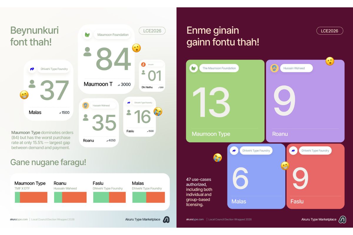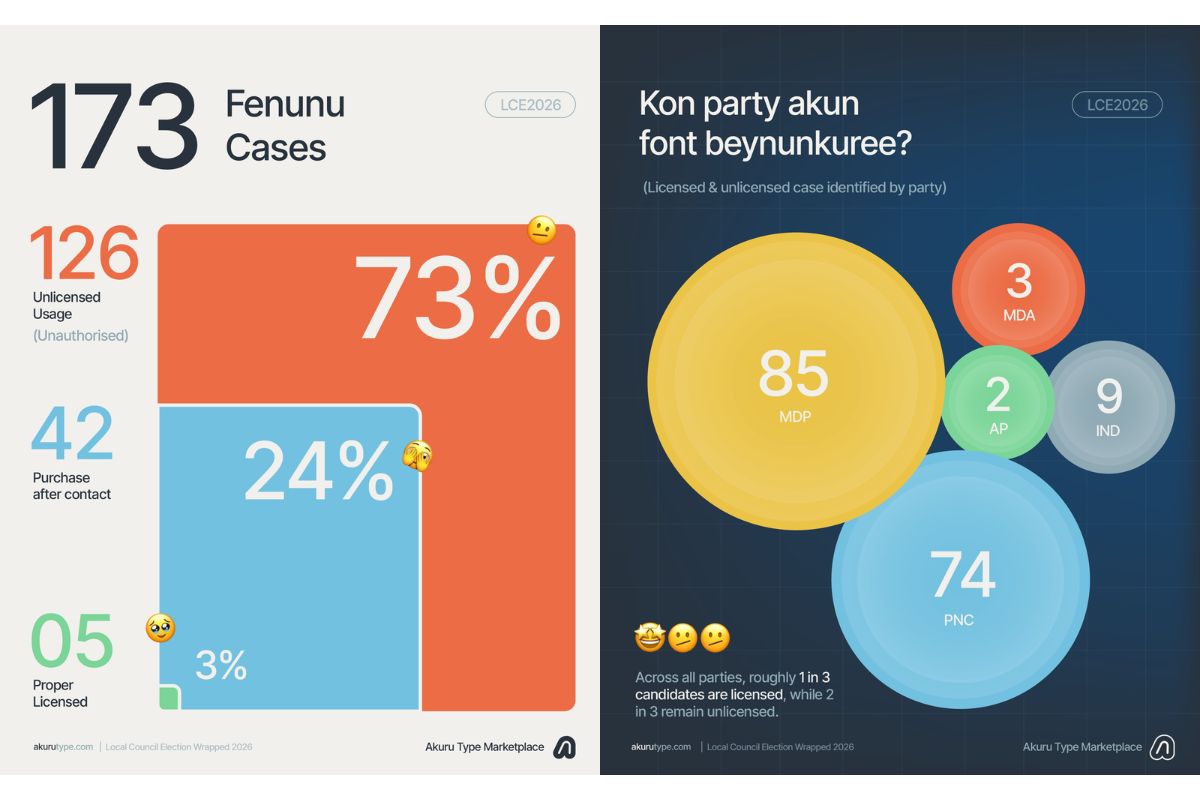 އަކުރުޓައިޕުން ކޮށްފައިވާ ޕޯސްޓްގައި ވާގޮތުން މިއިލެކްޝަންގައި އެޕްލެޓްފޯމްގައި ހިމެނިފައިވާ އެކި ފޮންޓުތައް ބޭނުންކުރި 173 ކެންޓިޑޭޓެއް ވަނީ ފެނިފައެވެ. އޭގެ ތެރެއިން ފަައިސާ ދައްކައިގެން، އޮންނަ އުސޫލުން ބޭނުންކުރީ އެންމެ 5 ފަރާތެކެވެ. އަދި މިމައްސަލަ ސަމާލުކަމަށް ގެނައުމުން، 42 ފަރާތްތަކުން ފައިސާ ދެއްކިކަމަށްވެއެވެ. އަދި ބާކީ 126 ފަރާތަކުން ލައިސަންސްޑް ފޮންޓްތަކަށް ފައިސާއެއް ނުދައްކައެވެ.