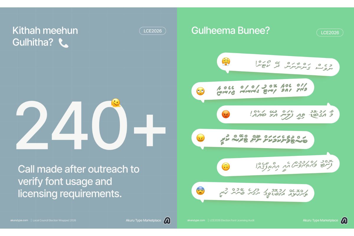 މިއެޕްރީލް މަހުގެ ކުރީކޮޅު ބޭއްވި ލޯކަލް ކައުންސިލް އަދި އަންހެނުންގެ ތަރައްގީއަށް މަސައްކަތް ކުރާ ކޮމެޓީގެ އިންތިހާބާއި ގުޅޭ ގޮތުން ގިނަ ބަޔަކު ނުދައްކާ ވާހަކައެއް ދައްކާލަން ހިނގާށެވެ. މިއީ އިންތިހާބުގެ ކެމްޕޭނަށް އެކި ކެންޑިޑޭޓުން ބޭނުންކުރި ޕޯސްޓަރުތަކުގައި، ލައިސެންސް ނެތި ފޮންޓު ބޭނުންކުރުމުގެ ވާހަކައެވެ.